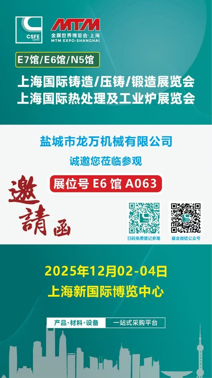 Yancheng Longwan Machinery Co., Ltd. weźmie udział w „Międzynarodowej wystawie stali/odlewów ciśnieniowych/odlewni w Szanghaju” oraz „Międzynarodowej wystawie obróbki cieplnej i pieców przemysłowych w Szanghaju”, która odbędzie się w Międzynarodowym Centrum Expo w Szanghaju w dniach 2–4 grudnia 2025 r. Wystawa ta przyciąga wiele wiodących firm z branży stali, odlewów i obróbki cieplnej. Yancheng Longwan Machinery Co., Ltd. wykorzysta tę platformę do zaprezentowania swoich najnowszych technologii i innowacyjnych produktów w dziedzinie produkcji maszyn.